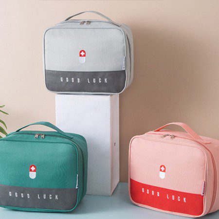 여행용 약파우치는 세련된 디자인과 다양한 색상(핑크, 그린, 그레이)으로 제공됩니다. 사용자의 취향에 따라 선택할 수 있어 구급함제작 및 판촉물로 활용 시 호응을 얻을 수 있습니다. 🎨