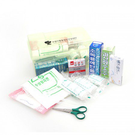 - 주요 구성품: 소독용 에탄올, 과산화수소, 밴드, 네모밴드, 탈지면, 가위, 핀셋, 붕대, 반창고, 물티슈, 투명 케이스 등
